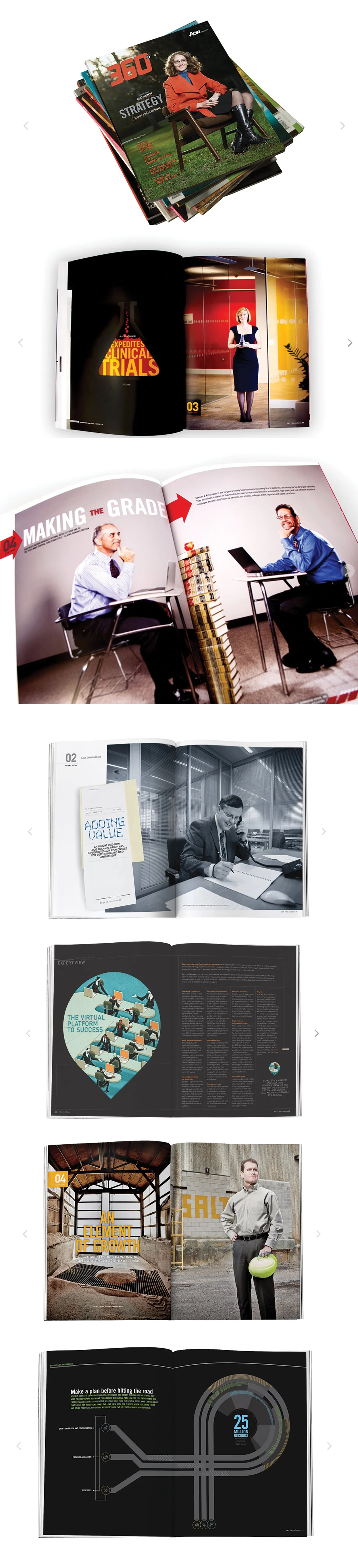 Aon, a Fortune 500 risk management firm, wanted its twice-yearly publication redesigned in a way that increased awareness of the company’s services among its prospects. Soloflight explored new content and visual treatments that would make the custom publication, 360°, more engaging for readers. Soloflight improved the photography style, reconsidered fonts, redesigned layouts, aggregated content into features and presented highly complex information through easy-to-understand charts. As a result, the publication became a storytelling tool that clearly conveyed the benefits to Aon’s audience.
